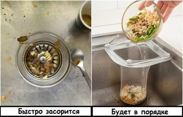 Щоб позбавити себе чергового головного болю, прикріпіть до краю раковини кутову сіточку. Викидати в неї відходи набагато простіше і зручніше, ніж у відро для сміття, тому що можна спокійно змітати всі недоїдки з тарілки разом з рідиною. Коли місце у сітці закінчиться, вийміть її та викиньте, замінивши на іншу.