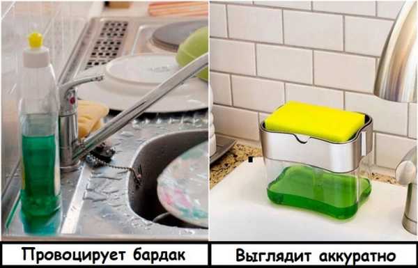Напевно, ви помічали, що кухня виглядає неохайно через губку, скребок і миючий засіб, які як неприкаяні стоять на борту раковини. Звичайно, можна щоразу прибирати їх у ящик під мийку, але це не надто зручно. Який існує вихід із цієї ситуації? Обзавіться дозатором-підставкою для миття посуду та губки. Він зможе вирішити одразу кілька проблем. По-перше, у нього естетичний зовнішній вигляд, який не псуватиме інтер'єр кухні. По-друге, цей гаджет надає можливість максимально компактно зберігати приладдя для миття посуду. А по-третє, дана конструкція дуже зручна – достатньо лише злегка надавати на губку, перш ніж взяти її з дозатора, щоб вона добре просочилася миючим засобом. І не потрібно постійно брати до рук і намагатися відкрити жирними руками флакон із рідиною для миття посуду – тут все продумано.