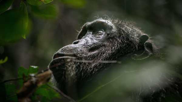Дикий шимпанзе в оточенні листя в лісі Кібале, Уганда.