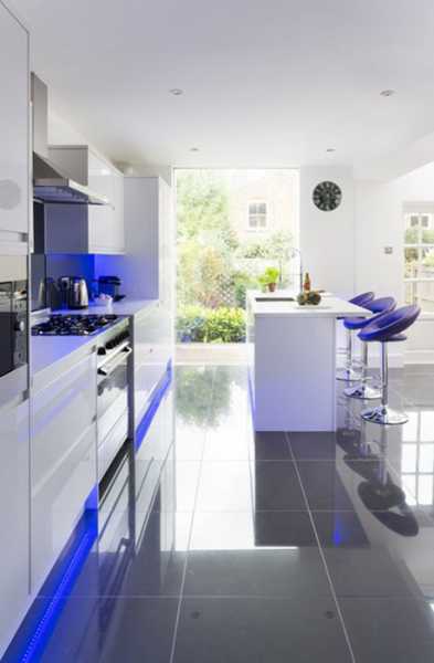 Білі меблі в мінімалістському стилі, світлодіодне підсвічування по підлозі та під навісними шафками створюють неповторну атмосферу та глибину. Хочеться чогось іншого? Змінюємо колір підсвічування залежно від настрою та випадку. Запрограмоване освітлення дозволить змінювати вигляд кухні простим натисканням кнопки.