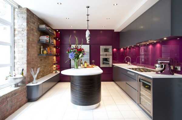 Варто поекспериментувати з яскравими та несподіваними квітами. Насичений бузковий чудово виглядатиме на тлі відкритої цегляної кладки та темно-сірих меблів. Відблиски скла та акрилу допомагають доповнити унікальну кольорову гаму.