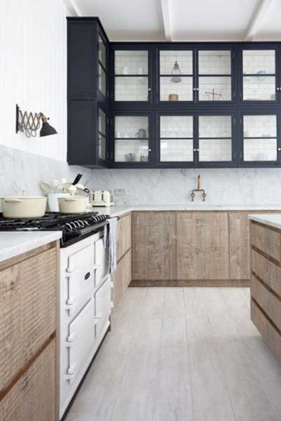 Зовсім необов'язково, щоб обробка верхніх та нижніх шафок була однаковою. У кухні грубі дерев'яні тумбочки внизу відмінно гармоніюватимуть із класичними ефектними шафками вгорі. М'якість та тепло дерева ідеально підходить також для створення контрасту кольорів.