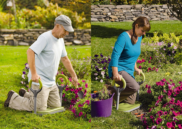 Першими були прості наколінники із щільної тканини, пізніше з'явилися садові килимки, стільчики та багато інших хитрощів. Цей винахід до всіх плюсів прабатьків додав ручки-упори, які регулюються по висоті. Сісти/встати можна без сторонньої допомоги, навіть якщо довелося працювати цілий день. Хочете просто відпочити? Заберіть ручки. М'яка посадка готова! Тепер подивимося на це із практичного боку. Таку підставку під коліна зі зручною подушечкою та ручками можна спорудити і самостійно. Вигляд у неї буде не такий космічний, але, якщо постаратися, можна створити дивовижну річ.