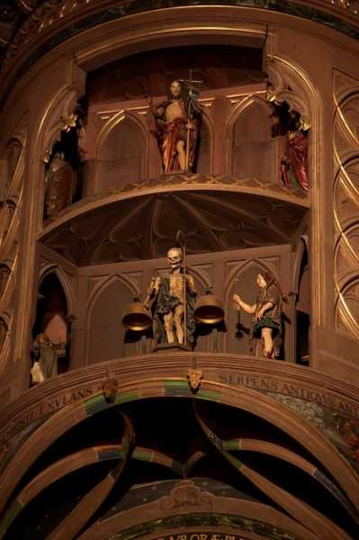 Крім складного механізму і вказівки декількох видів часу, Страсбурзький годинник приваблює до себе туристів фігурками, що рухаються. Кожну чверть години перед глядачами проїжджає одна із чотирьох статуеток. Спочатку з'являється немовля, потім юнак. Після нього настає черга зрілого чоловіка і, нарешті, старого. Усі вони миготять перед скелетом, що символізує смерть і тлінність буття.