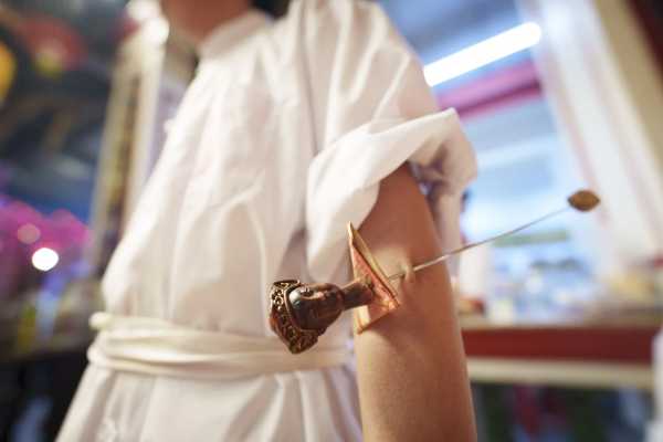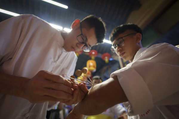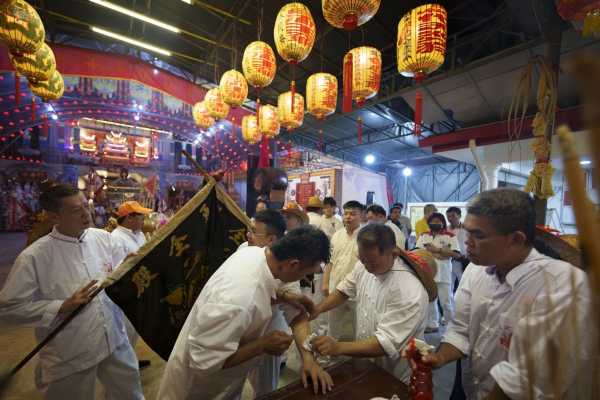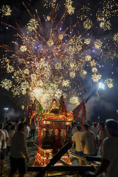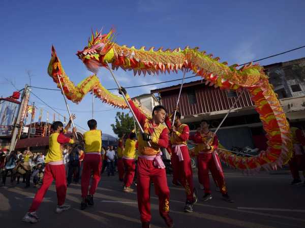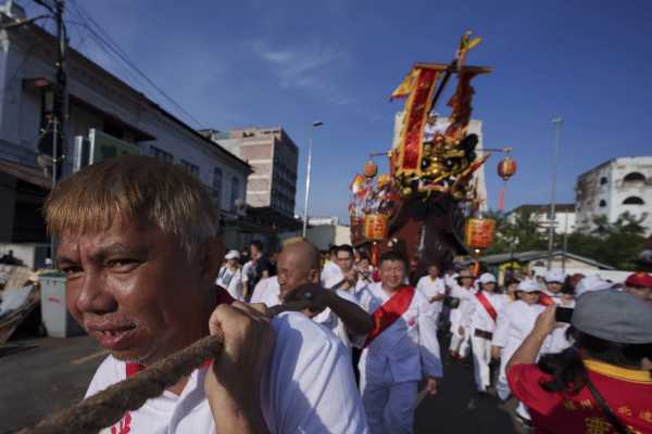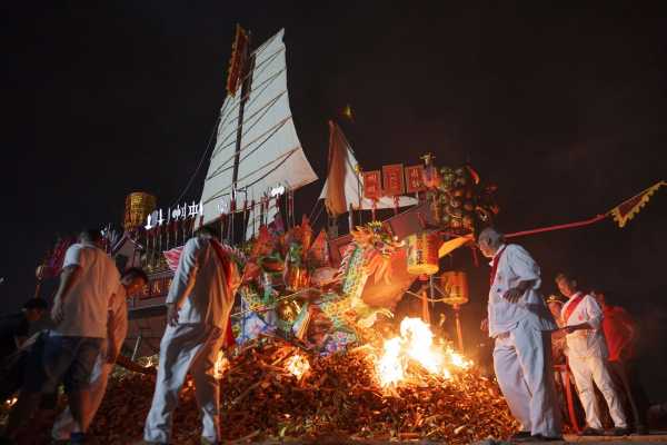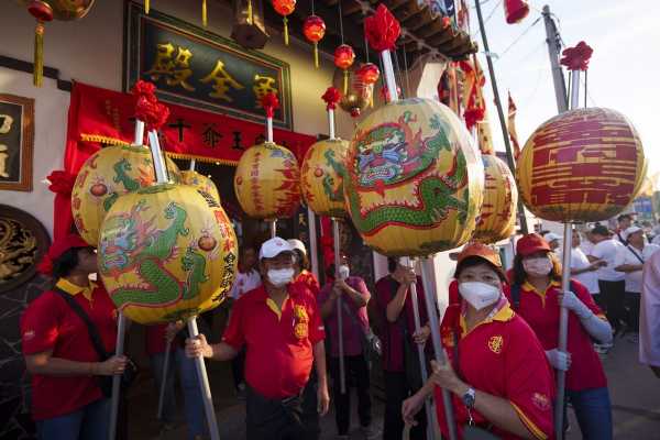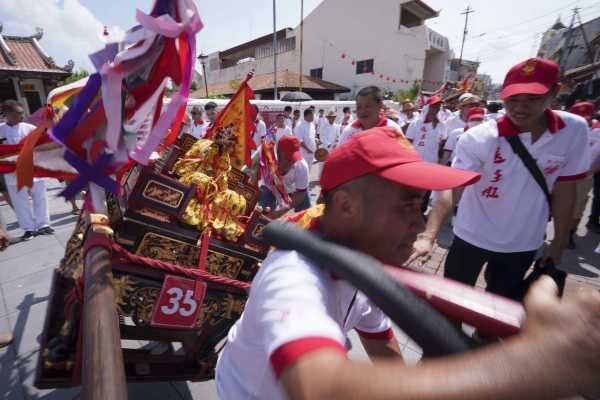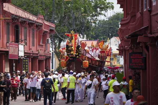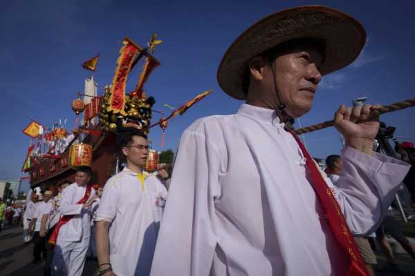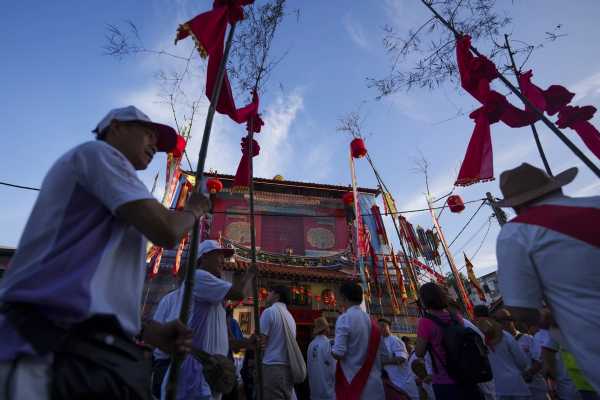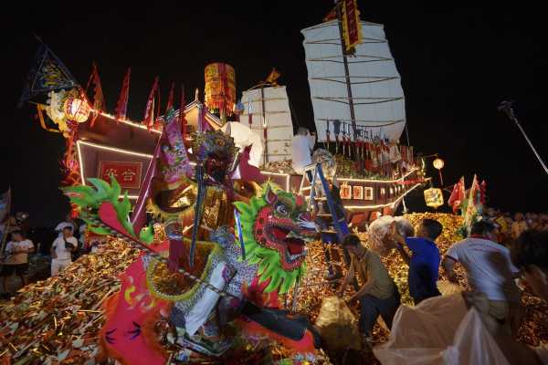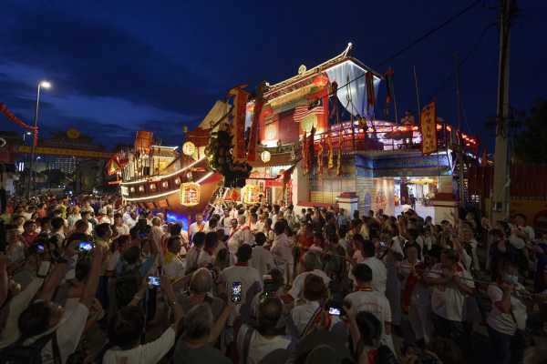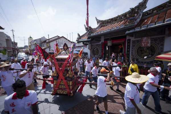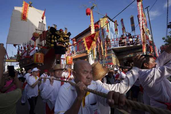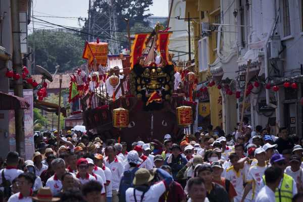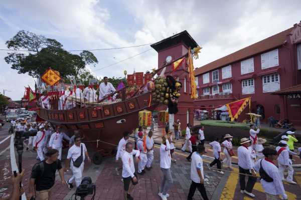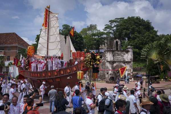 Віруючі з-поміж етнічних китайців відбуксирували гігантську копію королівської баржі на колісній платформі через малазійське місто в четвер у рамках рідкісної та барвистої процесії, спрямованої на збирання та вигнання злих духів.