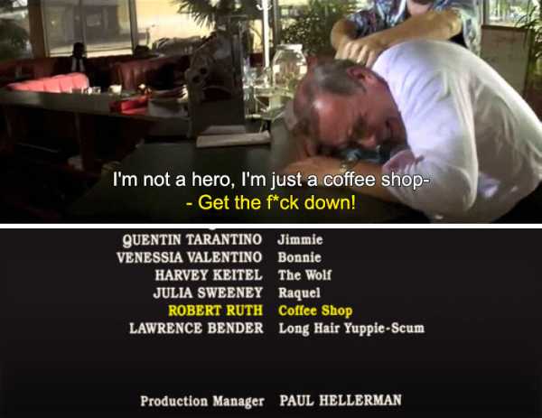 У фільмі «Кримінальне чтиво» один із акторів кричить: «Я не герой, я просто кав'ярня». У титрах так і вказано.