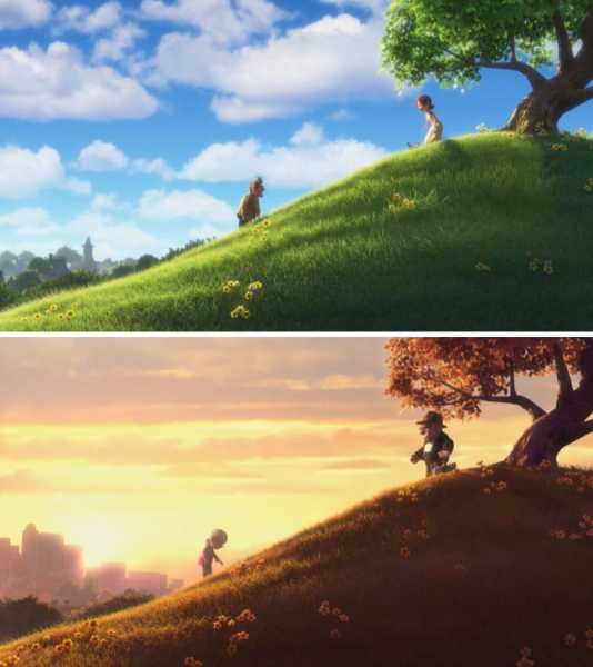У мультфільмі «Вгору» будинки на задньому фоні теж змінюються з роками.