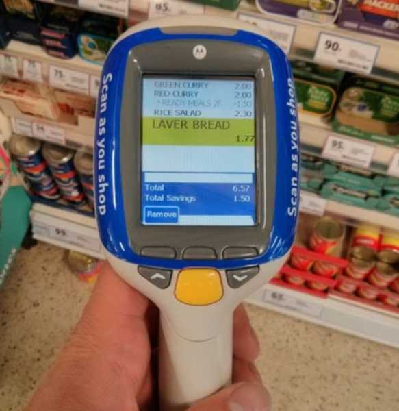 В Англії біля входу до магазинів є стенди з ручними сканерами. Таким чином, можна самим пробивати товари та не стояти в черзі на касі.