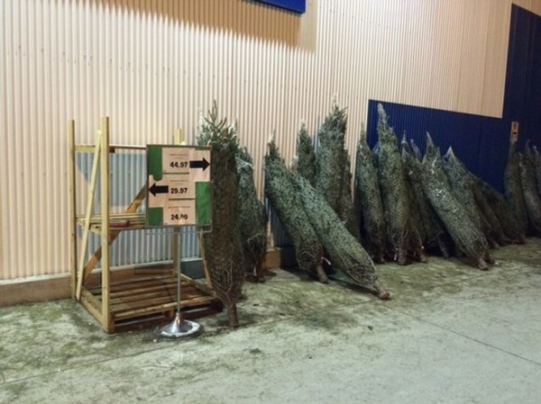 У Канаді є магазини, де можна придбати ялинку. Існує 2 варіанти ціни: 29,97 та 44,97 доларів. Оплачуєш товар на касі, виходиш і береш потрібну ялинку.