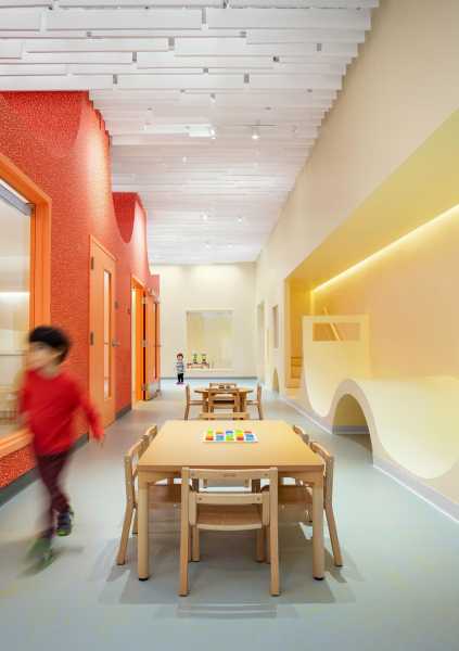 На відкритих майданчиках висота стелі досягає 4,5 метра, а її основною особливістю є світлові люки та білі акустичні екрани, що дозволяють приглушеному природному світлу переміщатися інтер'єром, дозволяючи дітям відчувати і спостерігати за тим, як освітлення та погода змінюються протягом дня.
