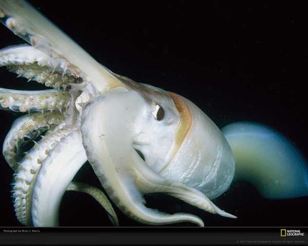 Гігантський кальмар чи кальмар Гумбольдта. Ці м'ясоїдні хижаки досягають у довжину 2-х метрів і важать понад 45 кілограмів. (Фото Brian J. Skerry):