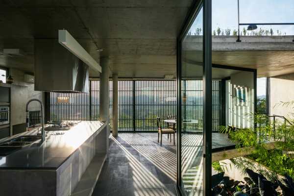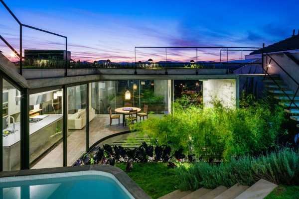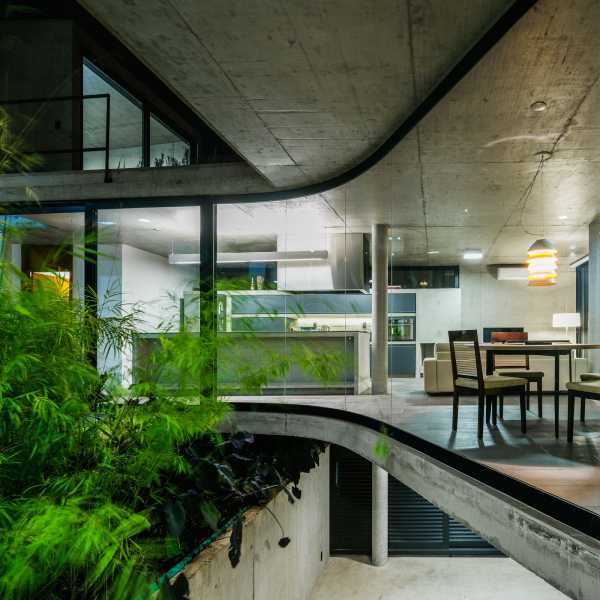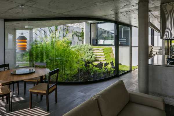 По-перше, шляхом створення інтимного природного середовища на відстані витягнутої руки, організувавши всі приміщення навколо невеликого зеленого патіо. Цей внутрішній дворик дозволяє мешканцям зберігати візуальний контакт між собою, перебуваючи у різних частинах будинку. Завдяки вигнутому склу, що обрамляє житловий простір, вид на патіо не сегментується і сприймається цілком.