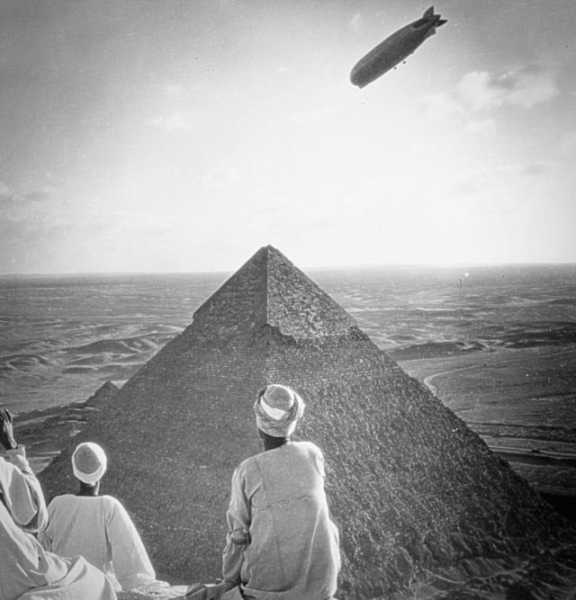 Єгиптяни дивляться, як дирижабль “Граф Цеппелін” падає на піраміди гизи. 1931 рік.