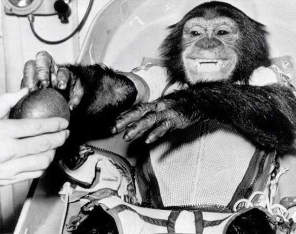 Астронавт шимпанзе отримує яблуко після першого успішного польоту до космосу, США, 1961 рік.