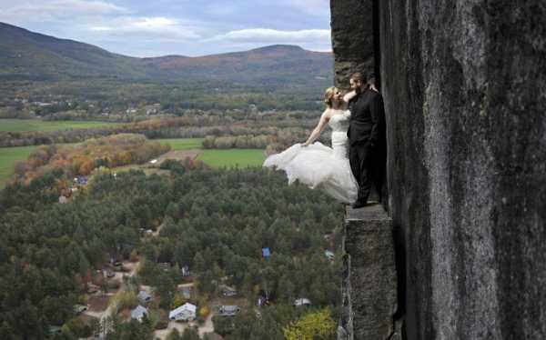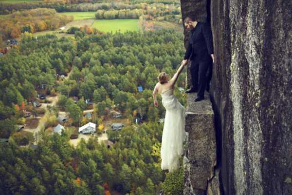 Слідом за китайськими нареченими, яких понесло на скелі за ефектними знімками, екстремальну весільну фотосесію в горах влаштували наречені зі США. Може здатися, що наречений грає зі смертю, але насправді їх надійно утримують на скелі хитро замасковані ремені безпеки.