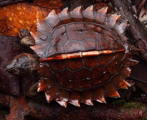 Колючі черепахи – нешкідливі тварини, незважаючи на свої гострі шипи по краях панцира та зубчастого кіля, розташованого на хребті. Але саме ці виступи допомагають молодим особам захищатися від ворогів. А темно-коричневий колір нерідко дає їм можливість зливатися з опалим листям.