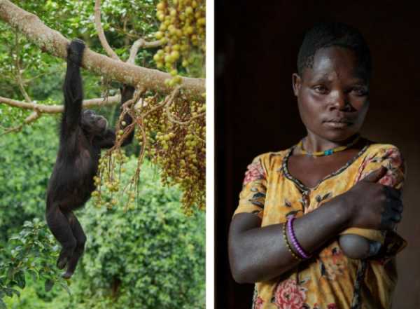 Шимпанзе, який втратив обидві стопи в людських пастках і Тедді Атухайрі, що втратила руку через напад примату.