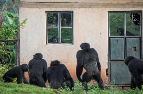 Шимпанзе дивляться у вікна ферми, яку Нтегека Семата покинула разом із сім'єю.