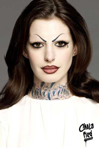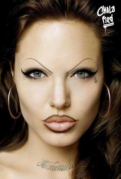 Якби знаменитості народилися в латинських гетто і ступили на слизьку кримінальну стежку, вони б виглядали якось так. Повністю вищипані брови та намальовані нові замість них, татуювання в районі очей та на шиї, губи, обведені олівцем темного кольору та накладні вії нереальних розмірів.