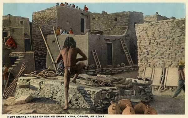 Священнослужитель хопі заходить у ківу, Ораібі, Арізона, 1920