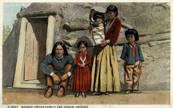 Сім'я навахо на тлі традиційного житла хоган, 1915