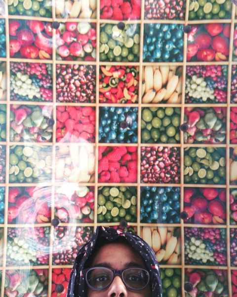 «На фотографіях обов'язково є половина мого обличчя і… вражаючий фон, який може виявитися з будь-яким малюнком: від безлічі фруктів (дині, ківі, а може бути, ананаси), шпалер з квітковим принтом, яскравих геометричних фігур до приклеєних пластикових квітів, метеликів або саморобних вертушок», — розповіла