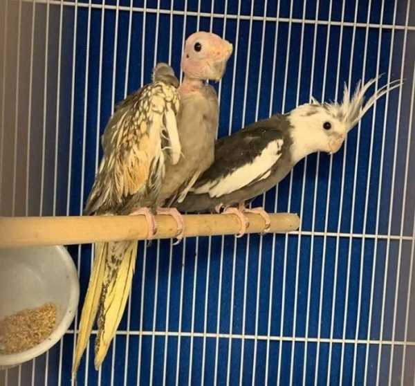 У цієї самки папуга випало пір'я, але один із самців закохався у птаха. Він захищає її, годує та грає з нею