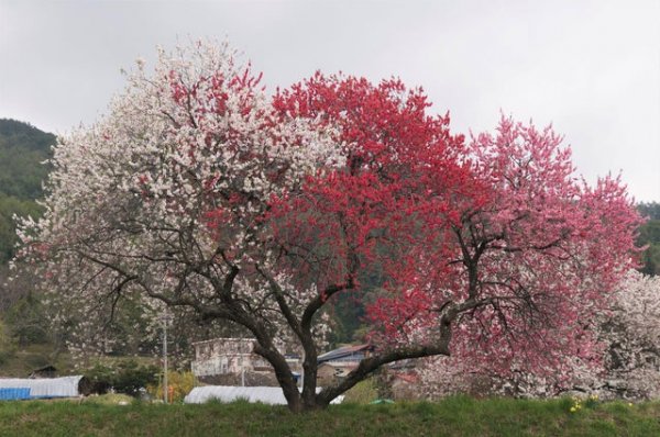 Це персикове дерево цвіте трьома різними кольорами.