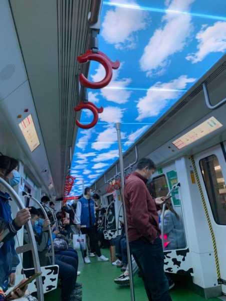 Цього поїзда метро хмари на стелі виглядають як небо.