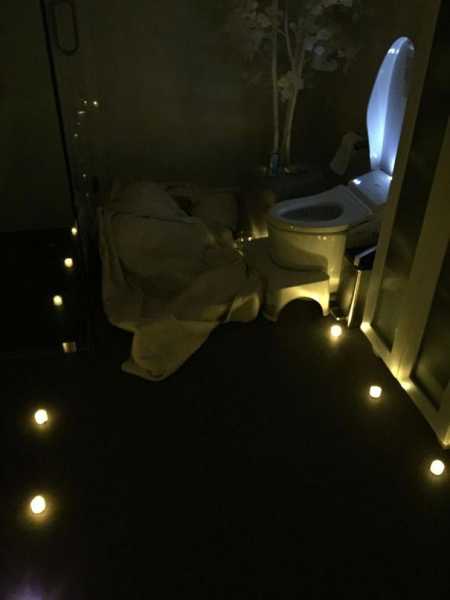 Дружина трохи перебрала з алкоголем, тому я постелив їй просто в туалеті, влаштувавши романтичну атмосферу за допомогою свічок. Також я одягнув на неї гумку для волосся і приніс воду, шкарпетки та спрей для носа. Сам я пішов спати (свічки працюють від батарейок)