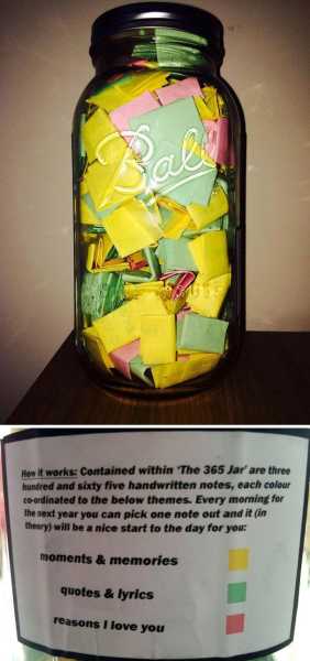Як це працює: Банку «The 365 Jar» містить 365 написаних вручну записок, кожна з яких позначена кольором відповідно до її теми. Щоранку наступного року ти братимеш по одній записці (теоретично), щоб твій день починався з чогось хорошого