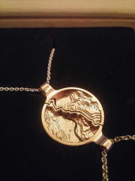 Я зробив мені та моїй подрузі кулон, що складається з двох частин із топографічною картою нашого міста. Розділова смуга – це дорога між нашими будинками