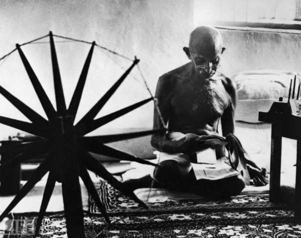 Махатма Ганді поруч із його прядкою — символом ненасильницького руху за незалежність Індії від Великобританії.