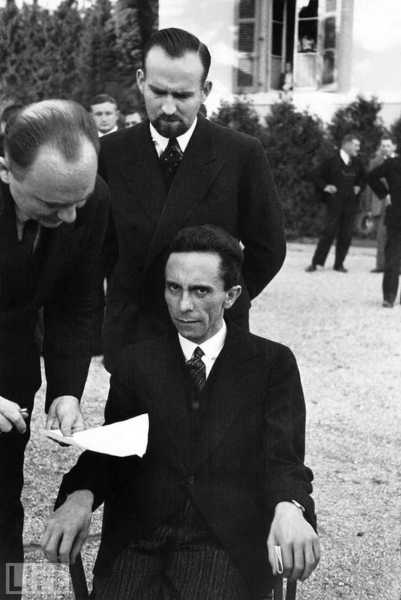 Тут зафіксовано момент, коли Геббелс (сидіт) дізнався, що його перекладач — єврей і привітна посмішка зійшла з його обличчя.