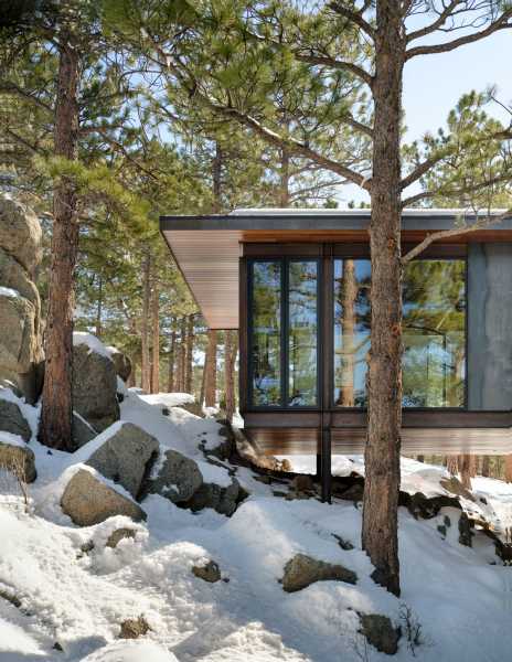 «Форма, площа основи та дизайн інтер'єру цього будинку відображають філософію життя з тим, що нам потрібно — і не більше», — розповіли у студії. Створення будинку, здатного пережити лісову пожежу, було головним завданням. Це стає все більш важливим міркуванням у Колорадо, де великі лісові пожежі стали звичайним явищем. Будинок площею 173 квадратні метри височить на два рівні і розташований поряд зі скелястим оголенням. Нижній поверх прямокутної форми і включає кухню, їдальню та вітальню. На верхньому рівні, що має форму літери L, знаходиться спальня та горище. Спальний обсяг піднімається над схилом пагорба за допомогою сталевих опор. На другому поверсі також знаходиться доріжка, яка проходить через громадську зону та закінчується на балконі, де мешканці можуть милуватися краєвидом.