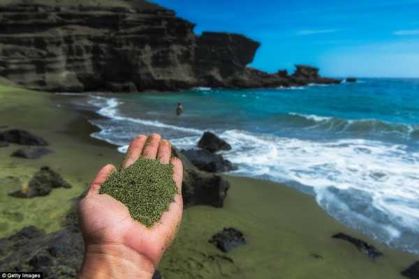 Пляж Папаколеа-Біч, Гаваї незабутній завдяки своєму відмінному зеленому піску, колір якого обумовлений вивітрюванням толеїту базальту.