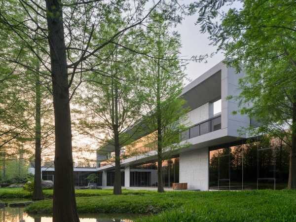 Штаб-квартира SY Construction, Тайчжун, Тайвань. Бетонна будівля розташована серед дерев.