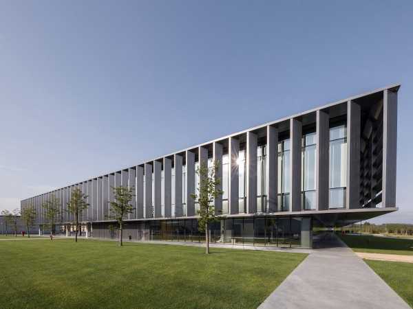 Центральна штаб-квартира швейної компанії Pull & Bear, в Нароні, Іспанія, є довгою, низькою будівлею, розташованою поруч із добре доглянутим газоном.