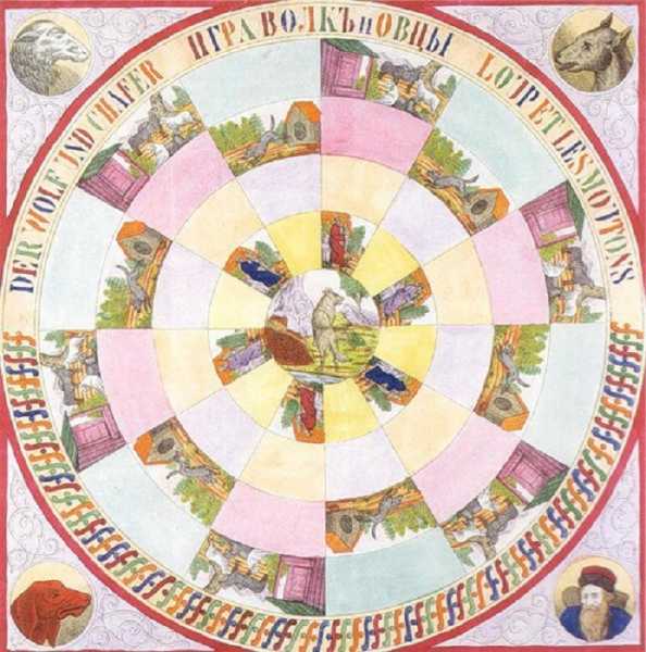 У грі «Вовк та вівці» беруть участь чотири особи. Завдання грає за Вовка: обійти собачі будки, і з'їсти овець. Інші – Сторожа, Собаки та Вівці – повинні перешкодити хижакові. Якщо у Вовка закінчуються ходи – він програв. Вівці цілі.