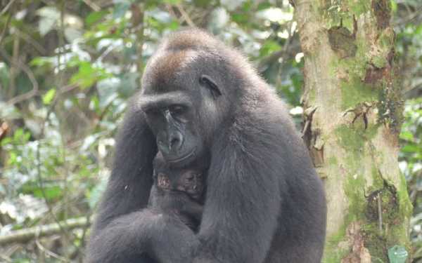 Горила Майомбі (Mayombe) тримає своє новонароджене дитинча. Її малюк, який народився 13 червня, є першим дитинчам горили, народженим у дикій природі у батьків, які виросли в неволі.