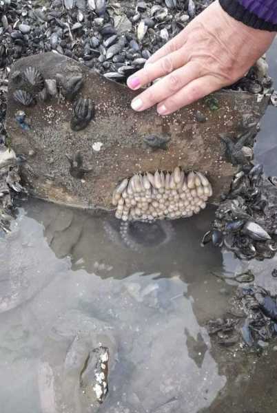 Яйця восьминога. Самка восьминога охороняє їх, перебуваючи під ними.