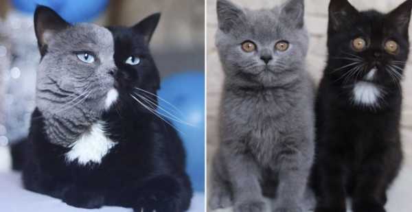 Кіт із двоколірною мордою — батько двох кошенят, кожен із яких перейняв один із його квітів.
