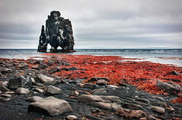 Сплячий троль – базальтова скеля Хвітсеркюр на північному заході Ісландії. Червоні водорості, велике каміння, драматичне небо. © Liz Glasco