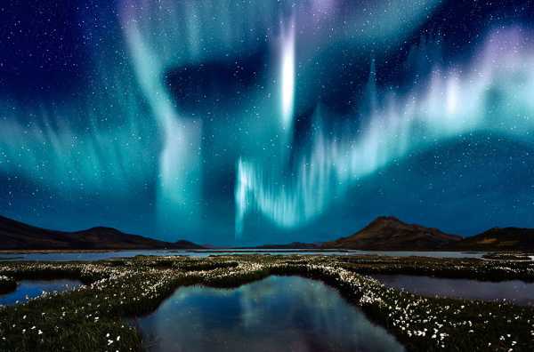 Полярне сяйво над болотом у долині Ландманналойгар. Відмінною рисою долини є кольорові гори ріолітові. © Corepics VOF