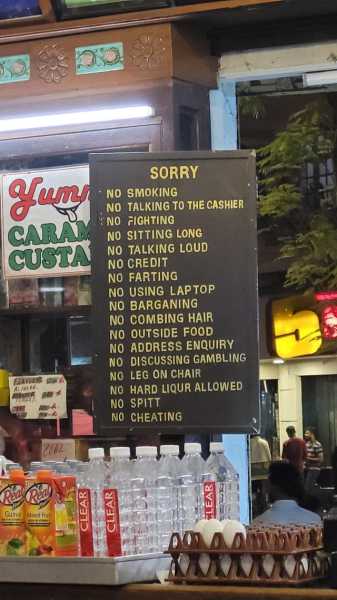 Чи не палити. Чи не розмовляти з касиром. Чи не битися. Довго не сидіти. Гучно не розмовляти. У борг не даємо. Жодних газів. Із ноутбуком не сидіти. Чи не торгуватися. Чи не зачісуватися. Жодної їжі на винос. Адреси не підказуємо. Азартні ігри не обговорюватимуть. Чи не класти ноги на стілець. Жодних міцних лікерів. Чи не плюватися. Чи не обманювати.