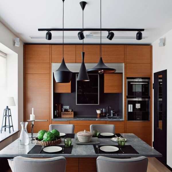 Світильники різних форм та розмірів дуже стильно виглядають над столом.