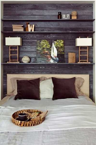Над ліжком створено кілька поличок, а сама стіна додатково обшита дерев'яними дошками, щоби підкреслити незвичайний стиль приміщення.
