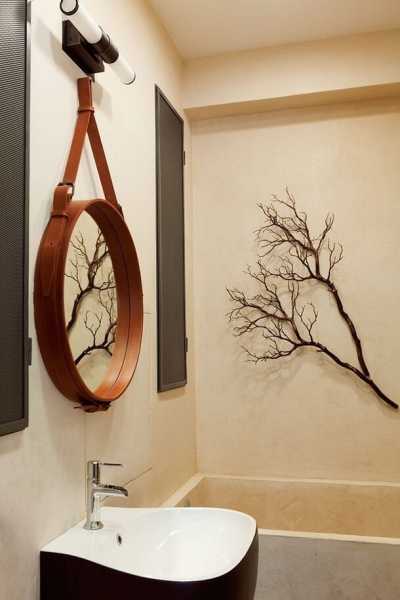 У ванній кімнаті дзеркало висить на товстому шкіряному ремені, а єдиним елементом декору стала засушена гілка.