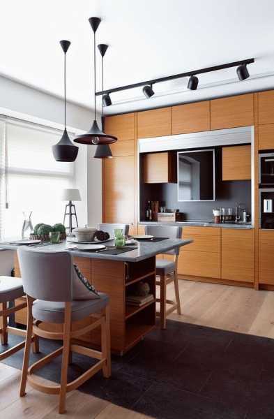 На кухні посередині є зона для приготування і вся необхідна техніка. Навколо робочої зони розташувалися шафи.