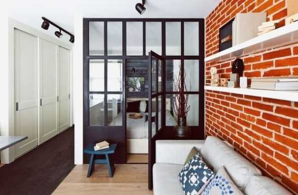 Цегляна стіна додатково створює затишок у квартирі. А незвична для маленької квартири форма стінки зі скла відмінно вписується в загальний інтер'єр.